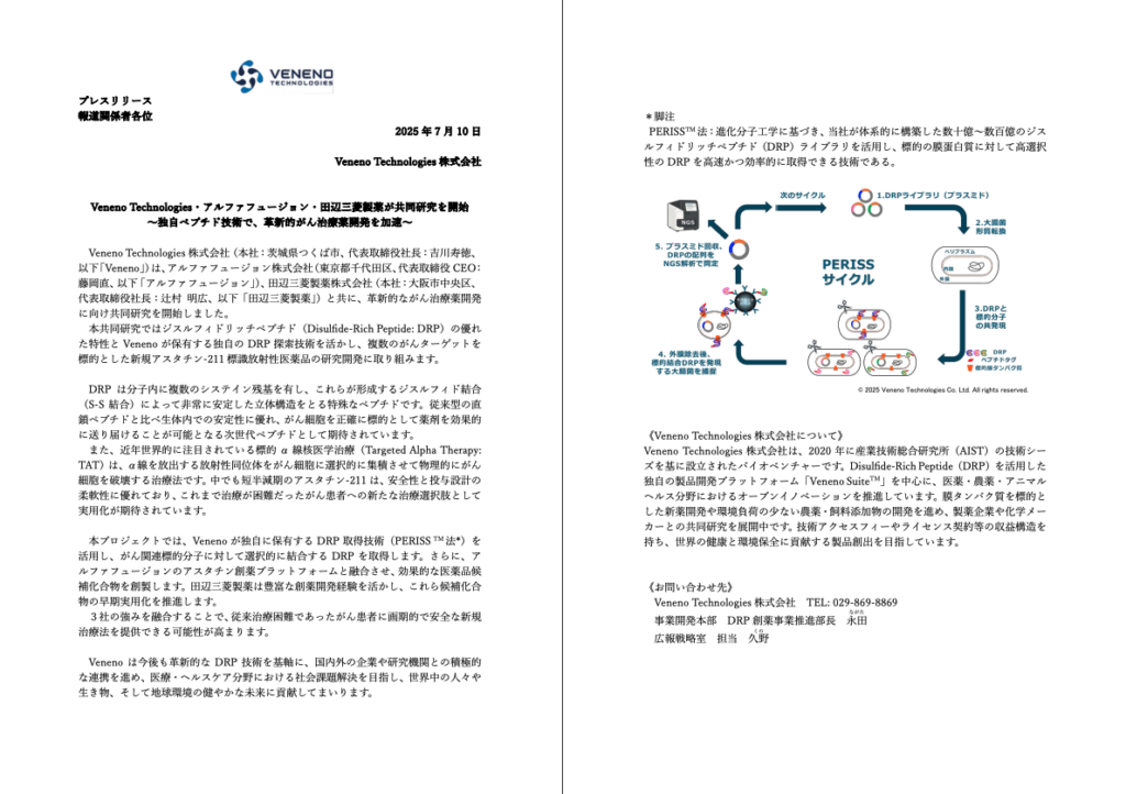 In this project, Veneno will use its proprietary DRP acquisition technology, the PERISS method, to obtain DRPs that selectively bind to cancer-related target molecules. These DRPs will then be integrated with Alpha Fusion’s astatine drug discovery platform to generate effective drug candidate compounds. Mitsubishi Tanabe Pharma will draw on its extensive drug discovery and development expertise to support the early practical application of these candidates.