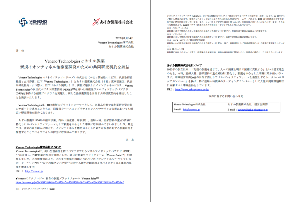 Veneno Technologies株式会社とあすか製薬株式会社は、両社で選択したイオンチャネルに対し、Veneno Technologiesの次世代ペプチド探索技術 PERISSを用いた機能性ジスルフィドリッチペプチド